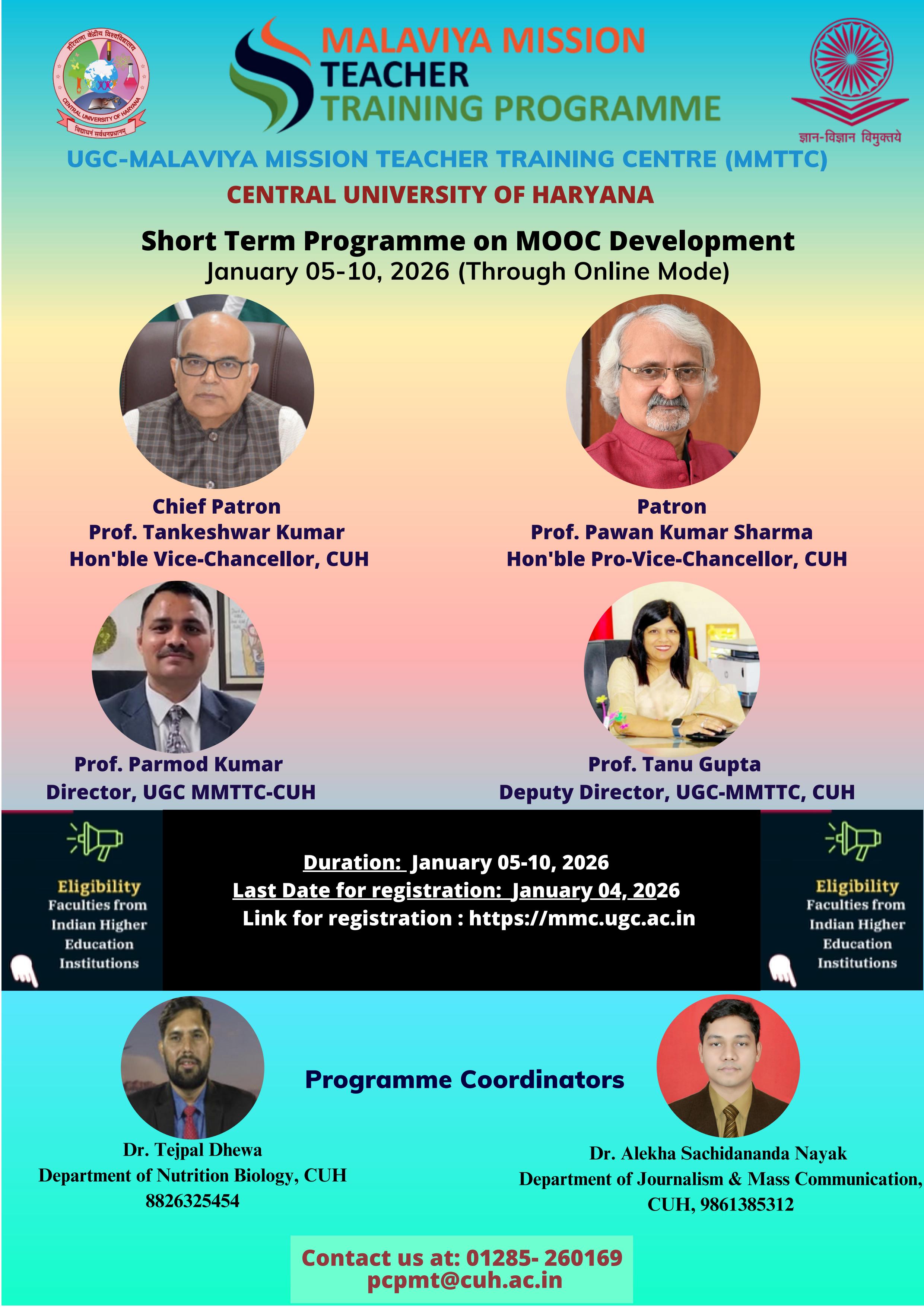 Short Term Programme on MOOC Development organized under the Malaviya Mission Teacher Training Programme (MMTTP) by the UGC–Malaviya Mission Teacher Training Centre (MMTTC), Central University of Haryana (CUH).